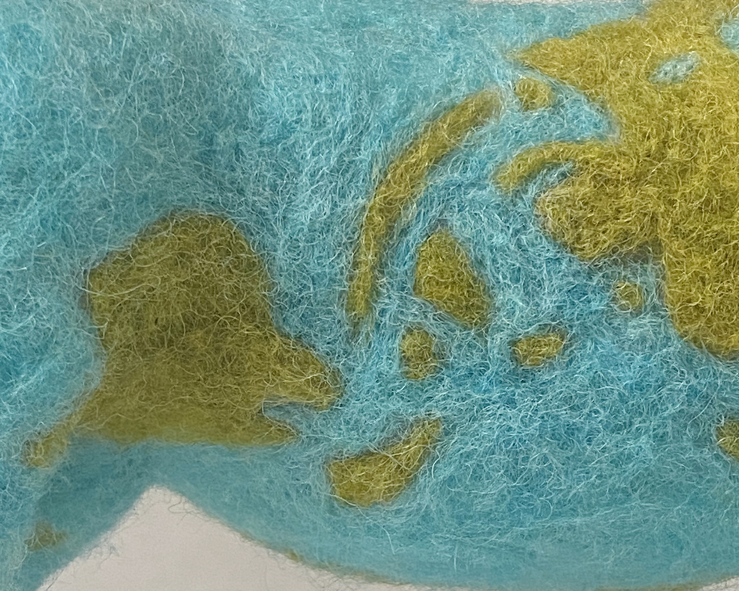 Gaia – Sacred Cow sculpture, needle felted wool over wire and batting armature with globe patterning – close up of sotth pacific