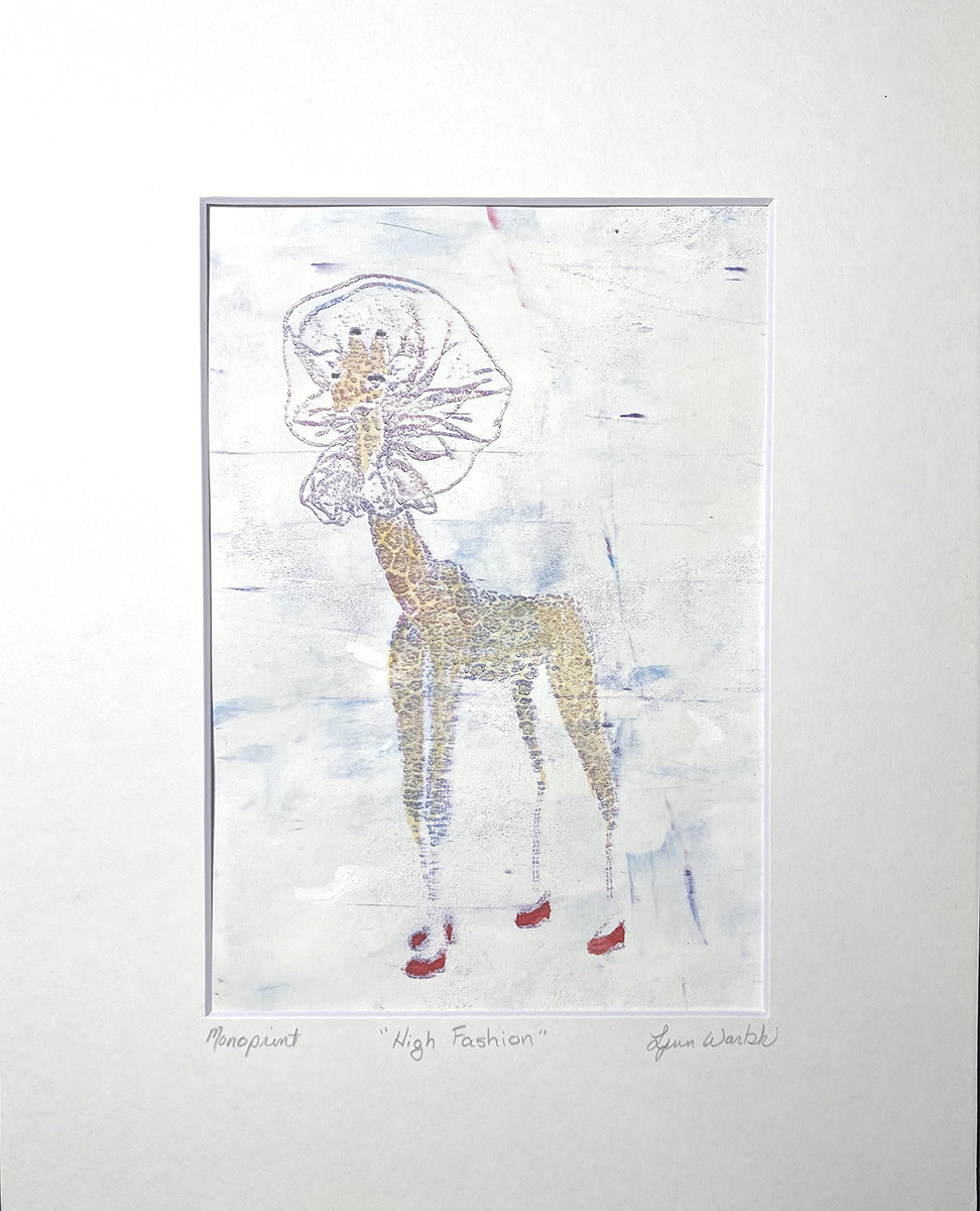 high fashion print 1 ← Previous Next → High Fashion print 1 8×10 2 color monoprint photo transfer of giraffe sculpture with watercolor hand coloring
