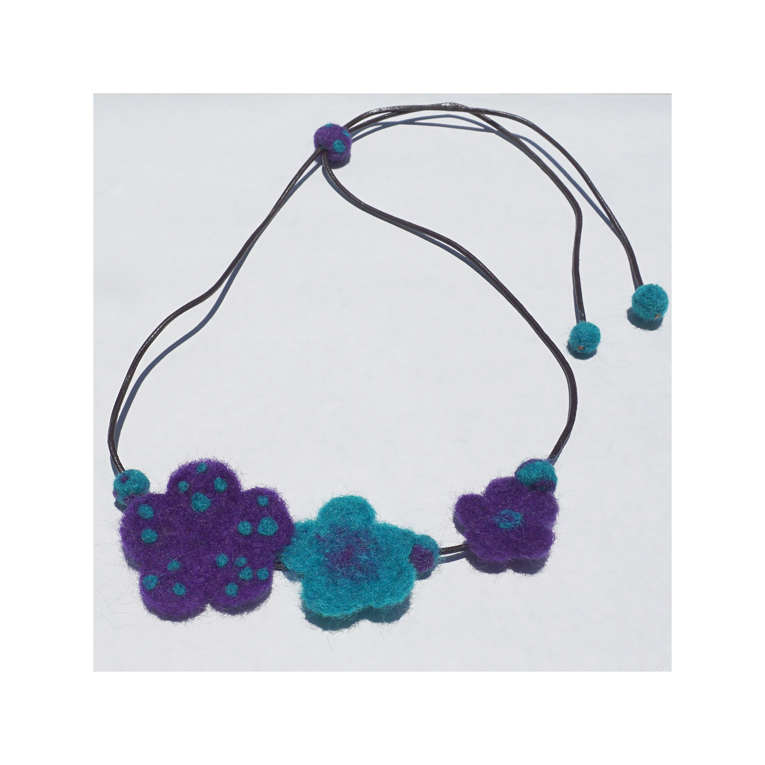 Lynn Wartski – Flower Necklace ← Previous Next → Flower Necklace Flower Necklace -purple and turquoise needle felted flowers on leather chord