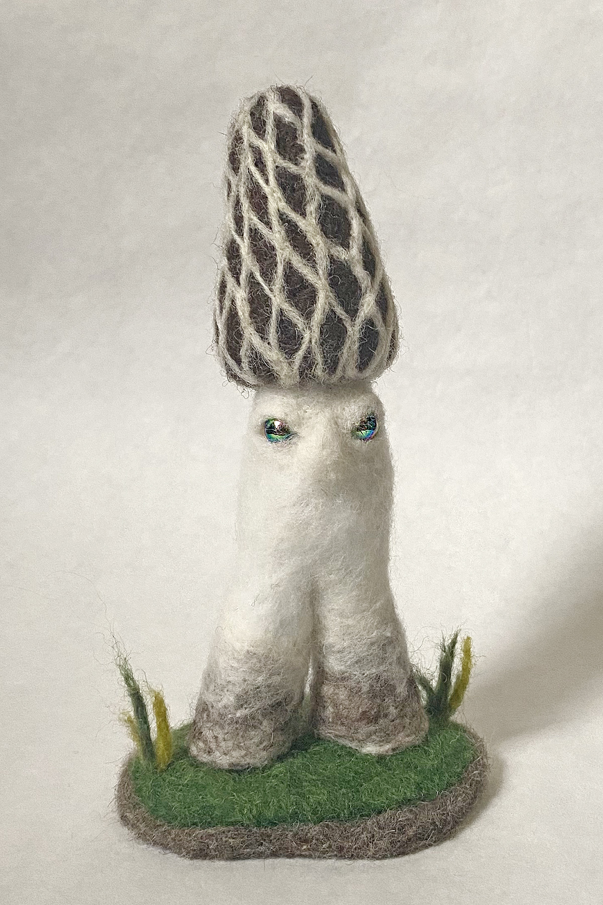 mini-morel ← Previous Next → Mini-Morel anthropomorphic morel mushroom figure sculpture, needle felted wool over wire and quilt batting, iridecent bead eyes