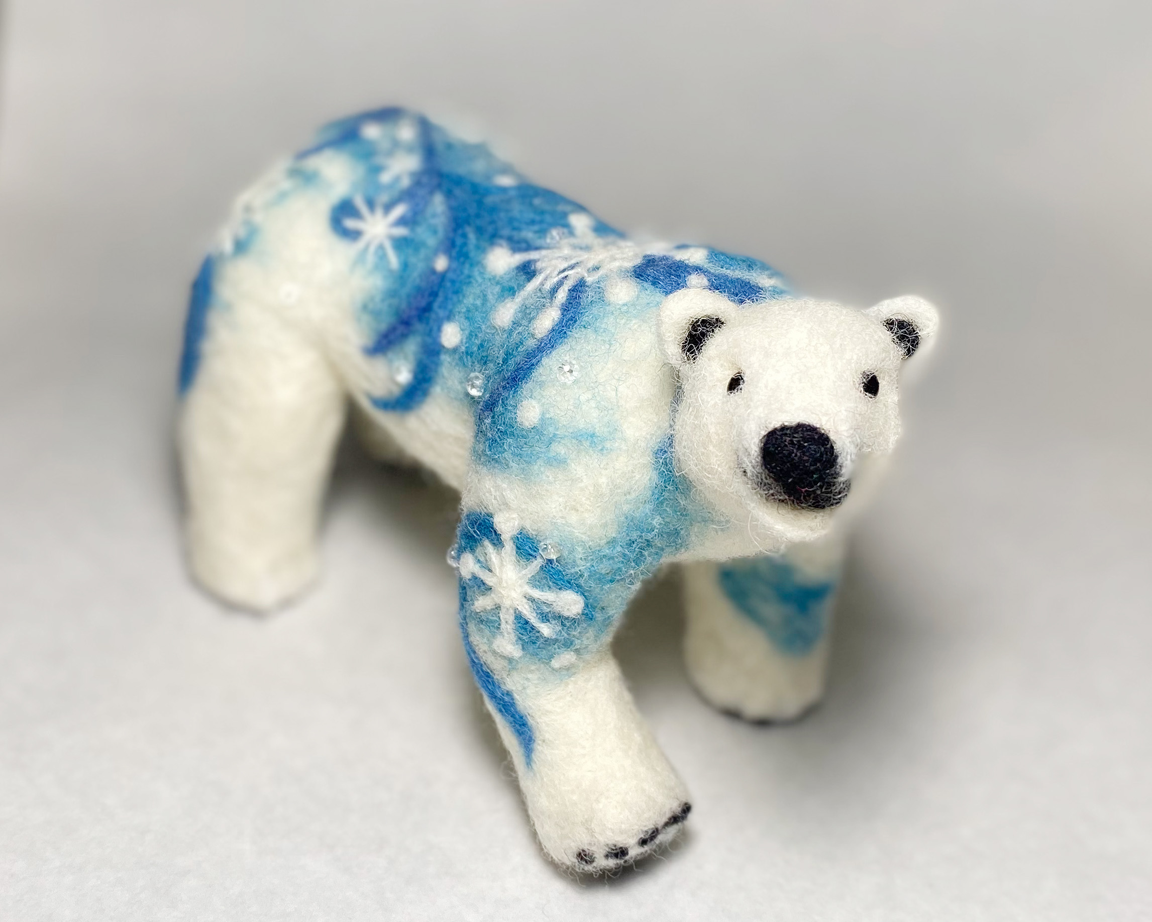 polar3 ← Previous Next → polar – facing Polar bear anthropomorphic sculpture with snow motif. Needle felted sculpture